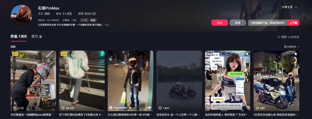 從“石膏ProMax”過往發佈的短視頻中可以看出,對於摩托騎士的身份,她感到十分驕傲,甚至為了所謂“遛車”,瘋狂到了走火入魔的地步。