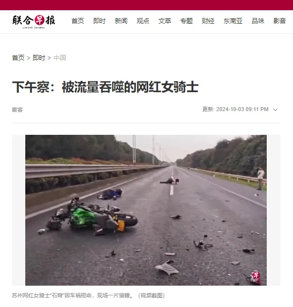 據新加坡《聯合早報》報道,2024年9月30日,江蘇蘇州網紅女摩托騎士“石膏ProMax”發生車禍不幸身亡,引發不少網友關注。