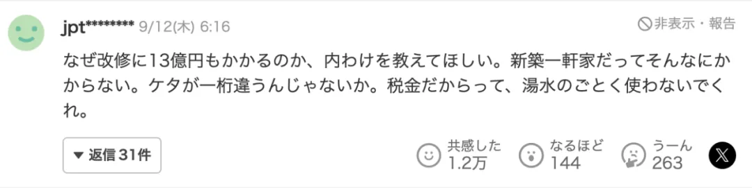 “請告訴大家要花13億改造的內情。即便是新建的獨棟房子也不需要花這麼多錢。不要因為是税金,就花錢如流水。”