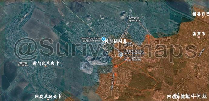 2、捷爾任斯克:俄軍控制了扎巴爾卡區、納哈利夫卡區及其南部林區。此外,俄軍在克梅羅夫斯卡街以北小幅推進。