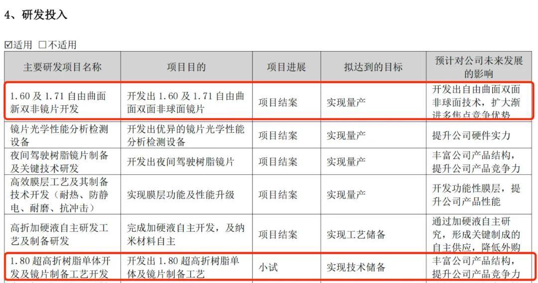 值得注意的是,2023年財報顯示,明月鏡片1.60及1.71自由曲面雙面非球面鏡片剛剛實現量產,且1.80超高折樹脂單體開發及鏡片製備工藝開發還在小試當中。