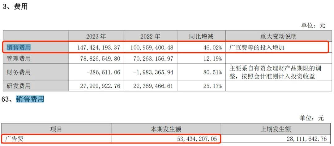 因此,明月鏡片的銷售費用也支出不少。2023年財報顯示,公司銷售費用為1.47億元,較2022年增長了46.02%。其中,廣告費就高達5343.42萬元,同比增長46.02%。2023年,明月鏡片銷售費用佔當期營業收入的比例為19.69%。
