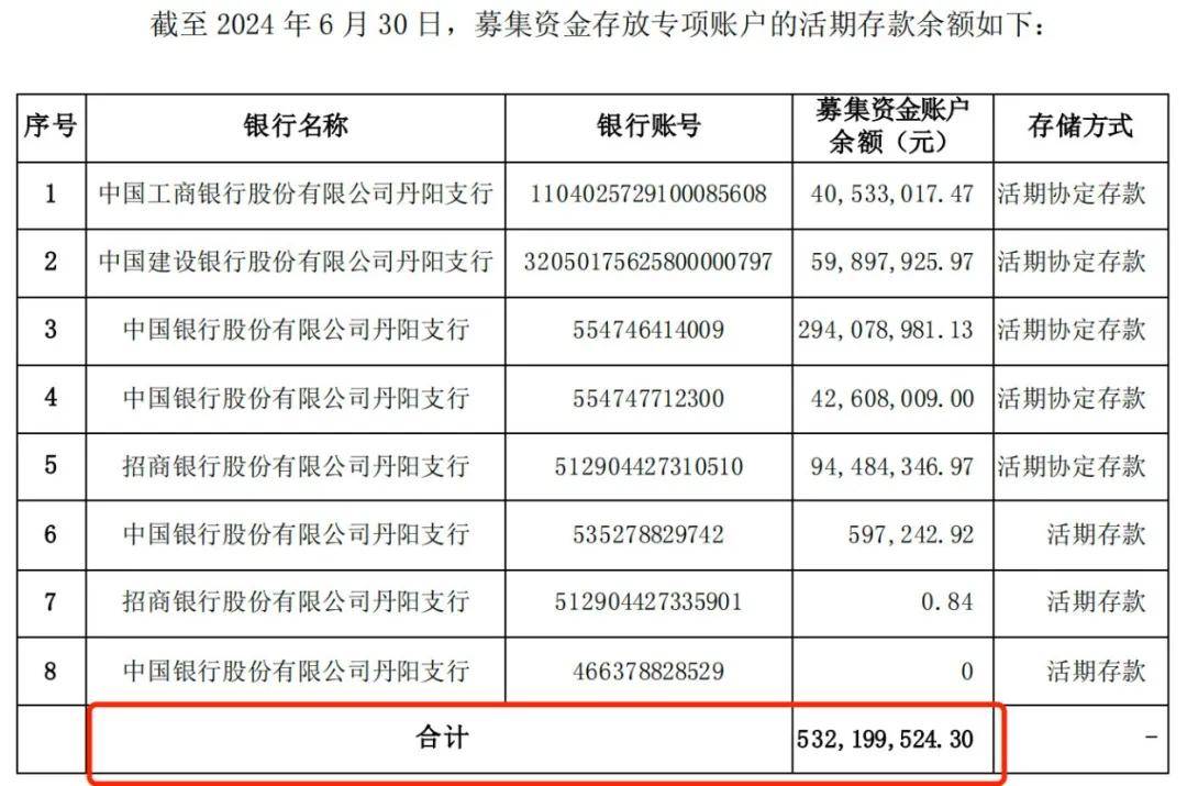 可見,上市近三年的明月鏡片,在IPO時預計投資的項目均沒有順利完成。公告顯示,截至2024年6月30日,明月鏡片募集資金賬户餘額5.32億元,均放在銀行賬户中吃活期利息。