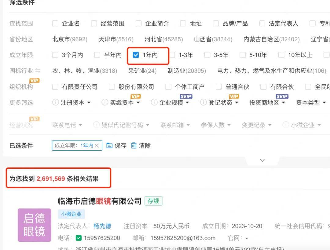 在我國,除了隱形眼鏡等品類外,框架眼鏡等其他眼鏡產品不屬於醫療器械,行業准入門檻低。在企查查中對“眼鏡”關鍵字檢索顯示,成立年限在1年內的企業就有269.16萬家。