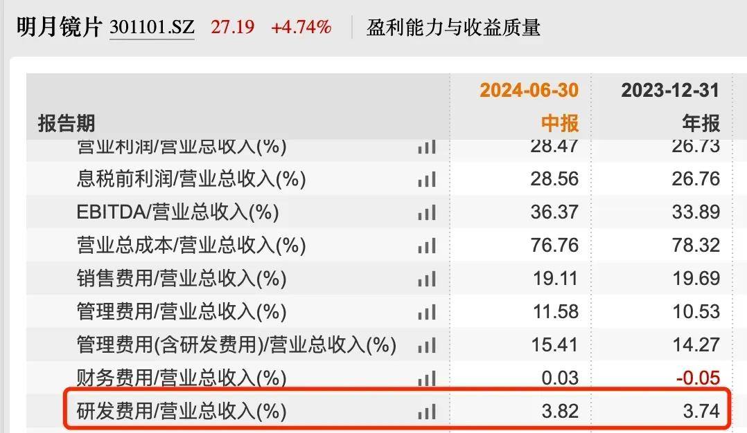 2024年上半年,同行公司康耐特光學的研發成本為4839.9萬元,佔當期收入的比例為4.96%,明顯高於明月鏡片。