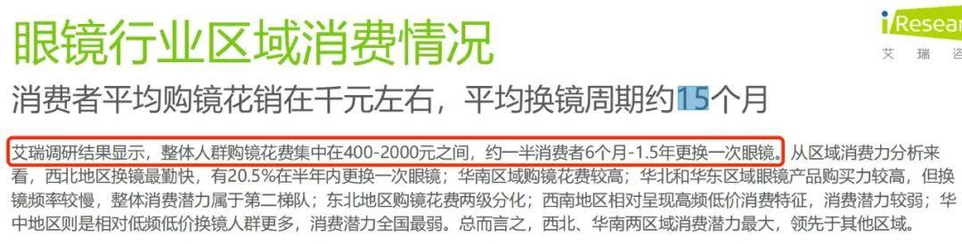 明月鏡片主營業務為光學鏡片。和其他消費品不同的是,眼鏡零售是一個低頻次消費。艾瑞調研結果顯示,消費者購鏡花費集中在400-2000元之間,平均換鏡週期約15個月。