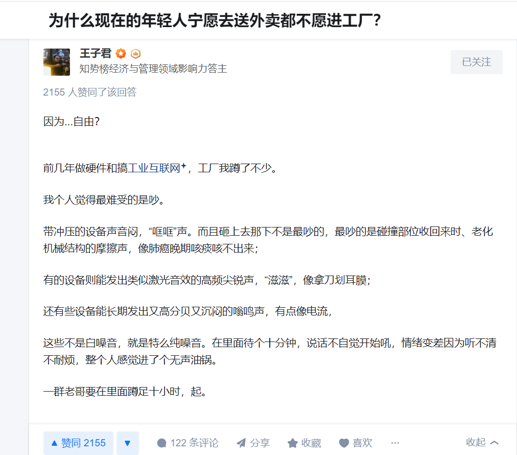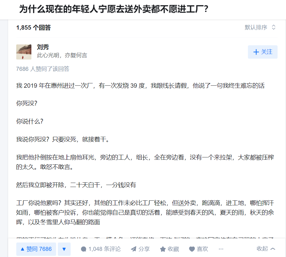 我曾經在高中畢業那年,在南方鞋帽工廠流水線上打工,我能深刻體會到,在工廠流水線上,人只是一個工具,這種簡單重複的勞作,應該完全交給機器來做,因為機器不需要感情。但人有感情,有悲歡,這種完全把人當作工具的行為,會摧毀一個人的精神,要麼讓他徹底麻木,要麼讓他更加暴戾。