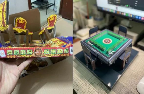 紙札麻將桌。左圖是市面上的產品,售價 20 元;右圖是老李的作品,售價 400 元