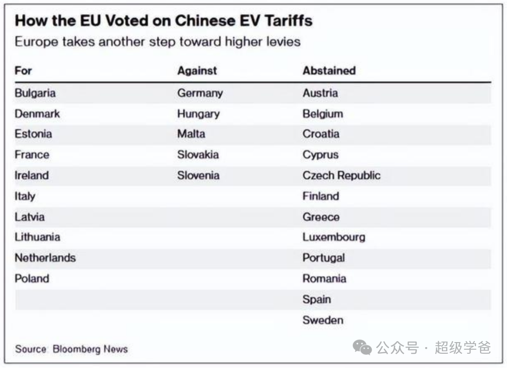 從這次投票上看,歐盟成員國對中國電動汽車的態度,也並非鐵板一塊,10國贊成(佔歐盟人口的46%),5國反對(佔歐盟人口的22.7%),12國棄權(佔歐盟人口的21.4%)。