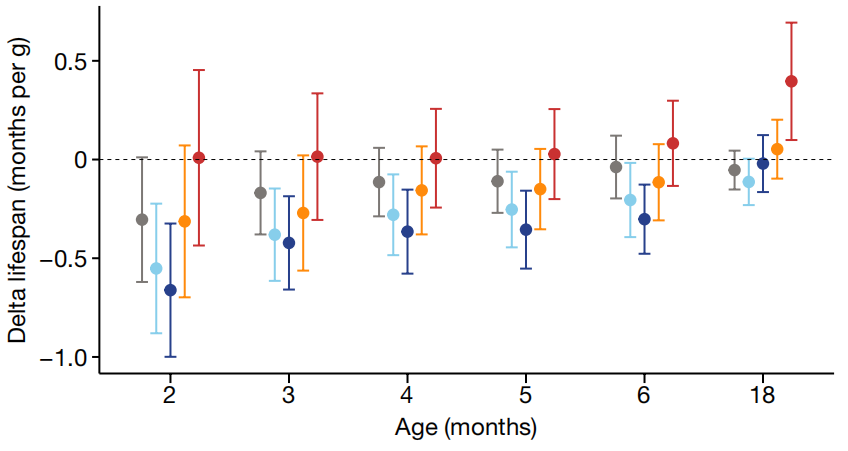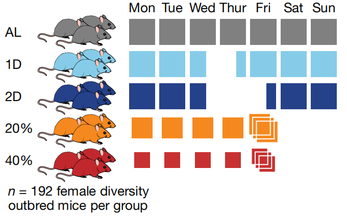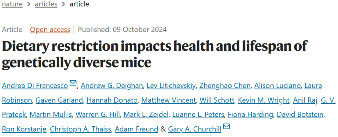 [1] Di Francesco, A., Deighan, A.G., Litichevskiy, L. et al. (2024). Dietary restriction impacts health and lifespan of genetically diverse mice. Nature. https://doi.org/10.1038/s41586-024-08026-3