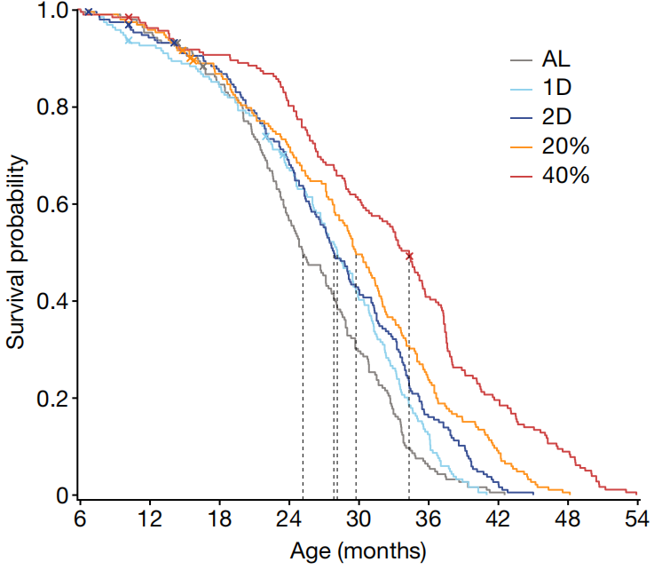 全部960只小鼠生命終結後,研究者們終於總結出了規律:程度越高的DR延壽效果越好!40%熱量限制>20%熱量限制>2日禁食>1日禁食>正常飲食,各組小鼠的中位生存時間分別約為34月、30月、28月、27月和25月,最長的足有最短的1.363倍。