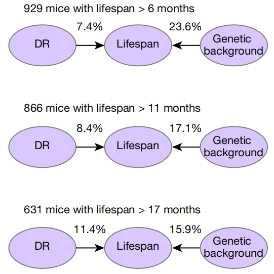 在本文研究中,遺傳背景只能解釋23.6%的壽命變化,且隨着年齡的增加,這一數值還會慢慢降低至18月齡時的15.9%;遺傳影響的佔比降低了,此消彼長的自然就是環境因素,作為小鼠生命中環境因素的主要構成者,飲食的影響不斷增加,但到18月齡時也才11.4%。