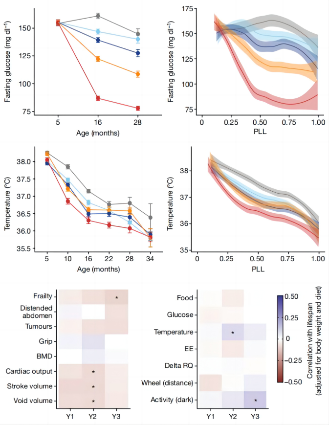 為了更明確地證明“DR引起的代謝改善不能延壽”,研究者又篩查了一遍和DR存在顯著關聯的生理反應,的確從中找到了改善葡萄糖穩態、降低能量消耗、降低體温和保持代謝靈活性(呼吸商增量)等代謝指標,但它們和壽命之間的關聯性卻幾乎不存在。