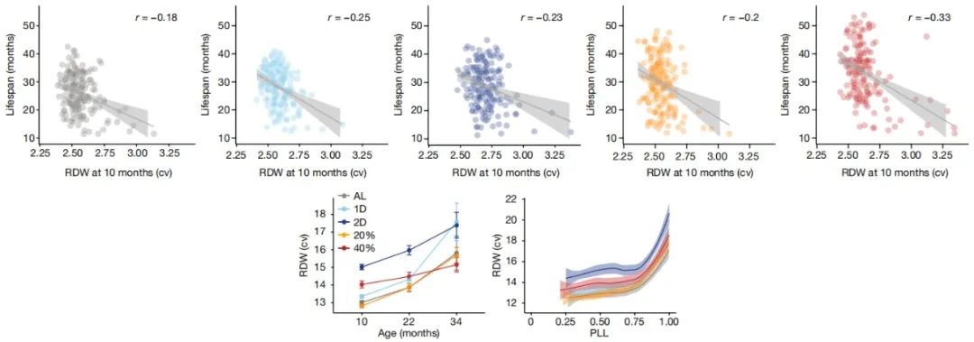 血液學特徵方面,主要的紅細胞性狀(血紅蛋白、血細胞比容、紅細胞計數)也會隨着年齡的增長而下降,紅細胞體積變異係數和紅細胞血紅蛋白濃度變異係數則會增加,這些都與壽命密切相關,它們的巨大波動甚至能直接指向死亡,而高程度的DR也能解決這一問題,通過緩解其波動和變化延長壽命。