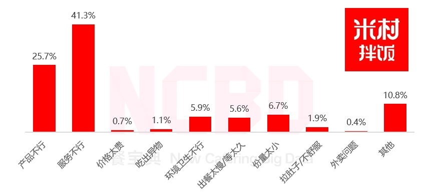 米村拌飯的差評主要集中在服務方面,佔比41.3%,遠高於其他快餐品牌,其中較多是因為排隊問題而引發的;產品方面的差評比例為25.7%;此外,有5.9%的差評與環境衞生有關。