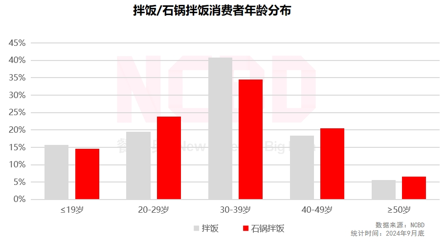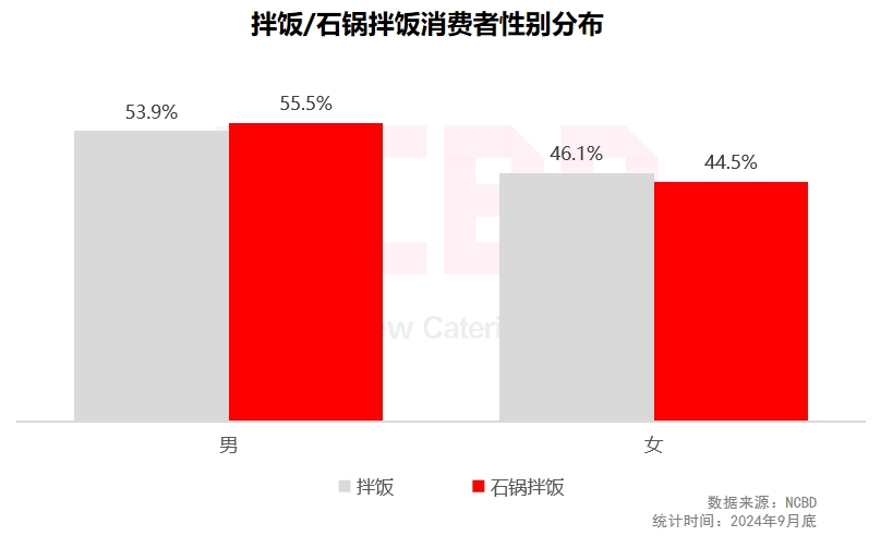 5、從拌飯的消費者性別分佈來看,男性佔比53.9%,女性佔比46.1%;其中在石鍋拌飯的消費者中,男性比例略高,比例為55.5%