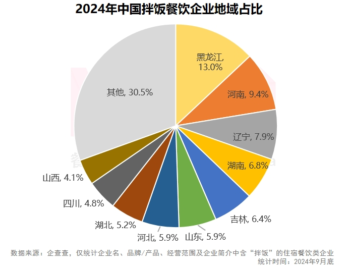 2、截至目前,全國有超過8000家拌飯類餐飲企業。其中,黑龍江拌飯企業數量全國第一,佔比13.0%;其次是河南(9.4%)、遼寧(7.9%);東三省拌飯企業數量佔全國總量的27.3%,超過1/4