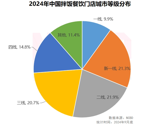 3、從拌飯門店的城市分佈來看,一線城市佔比9.9%、新一線城市佔比21.3%、二線城市門店佔比21.9%、三四線及以下城市佔比46.9%,拌飯在下沉市場有較大空間