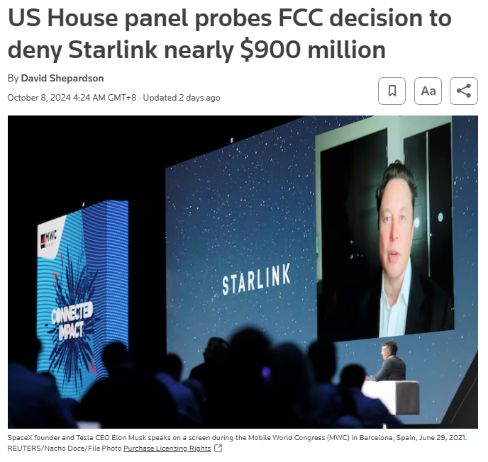 4.説(民主黨政客主導的)聯邦機構非法剝奪了Starlink給美國邊遠鄉村地區提供高速寬帶服務的一箇中標項目。説前兩年Starlink參與了這個邊遠鄉村寬帶項目的投標,結果順利中標,因為產品出色,成本又低。最後被一個聯邦機構非法的否決,剝奪了項目。主要是委員會里三個民主黨人投了反對票。【這是個前兩年的事情,被重新翻出來,涉及的機構是FCC(聯邦通信委員會)。共和黨主導的眾議院這兩天立即對此事進行調查,質詢FCC。FCC當然維持自己的決定。這裏可以看出,馬斯克參與政治(包括選擇共和黨一側)是有切實的商業動機的,也立竿見影,得到反饋。在這些問題上,馬斯克認為民主黨是一堵牆,“深層國家”、官僚體系,背後有各種左翼價值觀驅動,無法溝通。共和黨講人情,講實際,能溝通,能反饋,能回報】