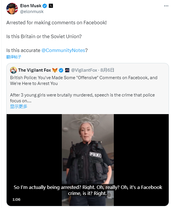 **21.説歐洲現在存在大量的言論管制。**説英國有一些由移民組成的犯罪團伙,跟蹤女性,綁架並輪姦。有人在網上抨擊這樣的事情,結果被認為是“仇恨言論”,並被判處徒刑。還説英國為了關押這些在網上發佈“仇恨言論”的人,不惜把戀童癖從監獄裏放出來以騰挪空間。【這些內容馬斯克都在X上轉發和評論過】
