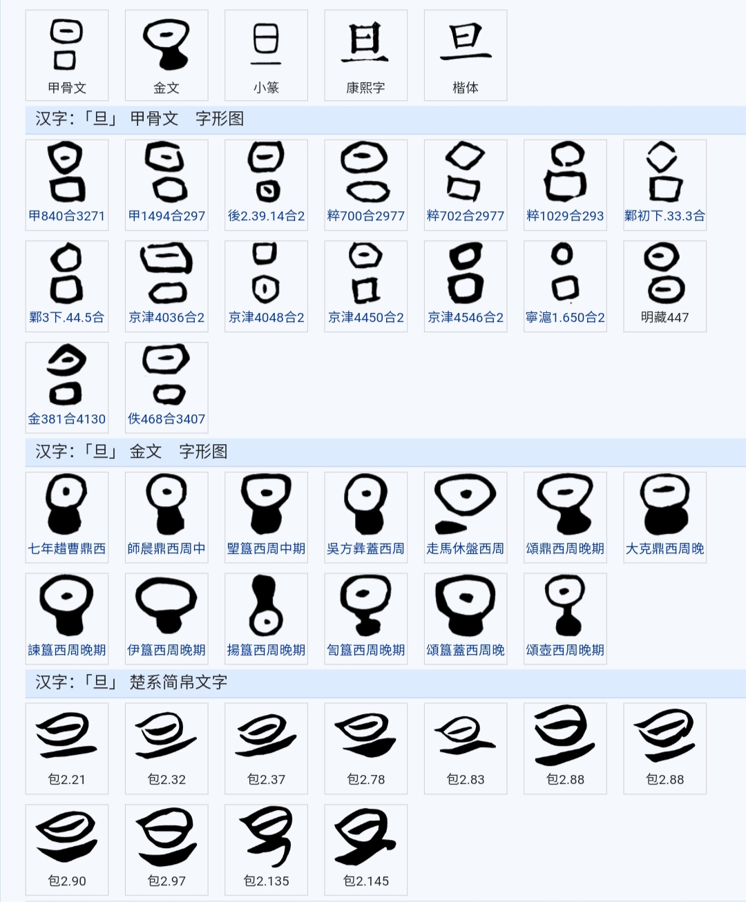 甲骨文【昔(日巛)、旦昌(日日)、昜(日T、日T彡)】詞例:昔丁丑文武帝。昔乙酉。昔祖丁不黍唯南。旦湄至昏、旦至於昏不雨。於南門旦(壇)。於毓祖丁旦。 翌日父甲旦其十牛。 王其(宀夨)自旦於室。昜白(伯)、在昜。