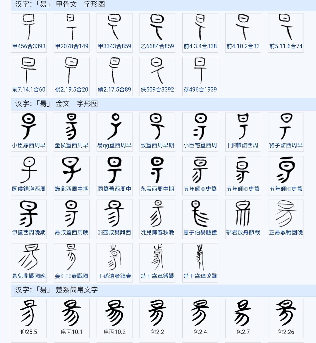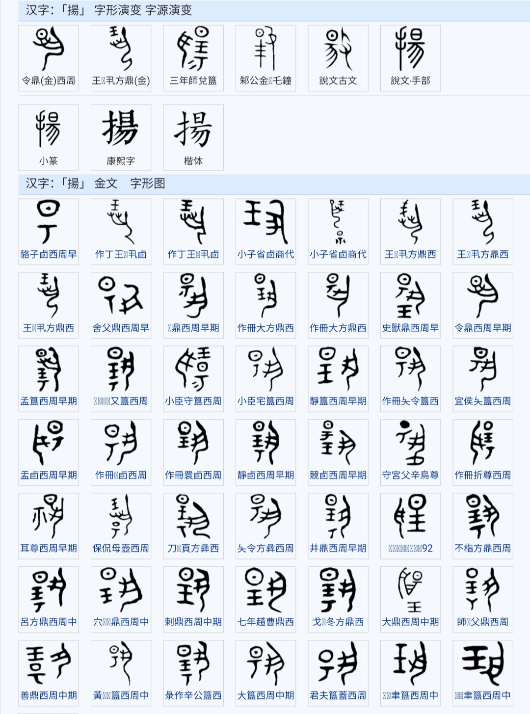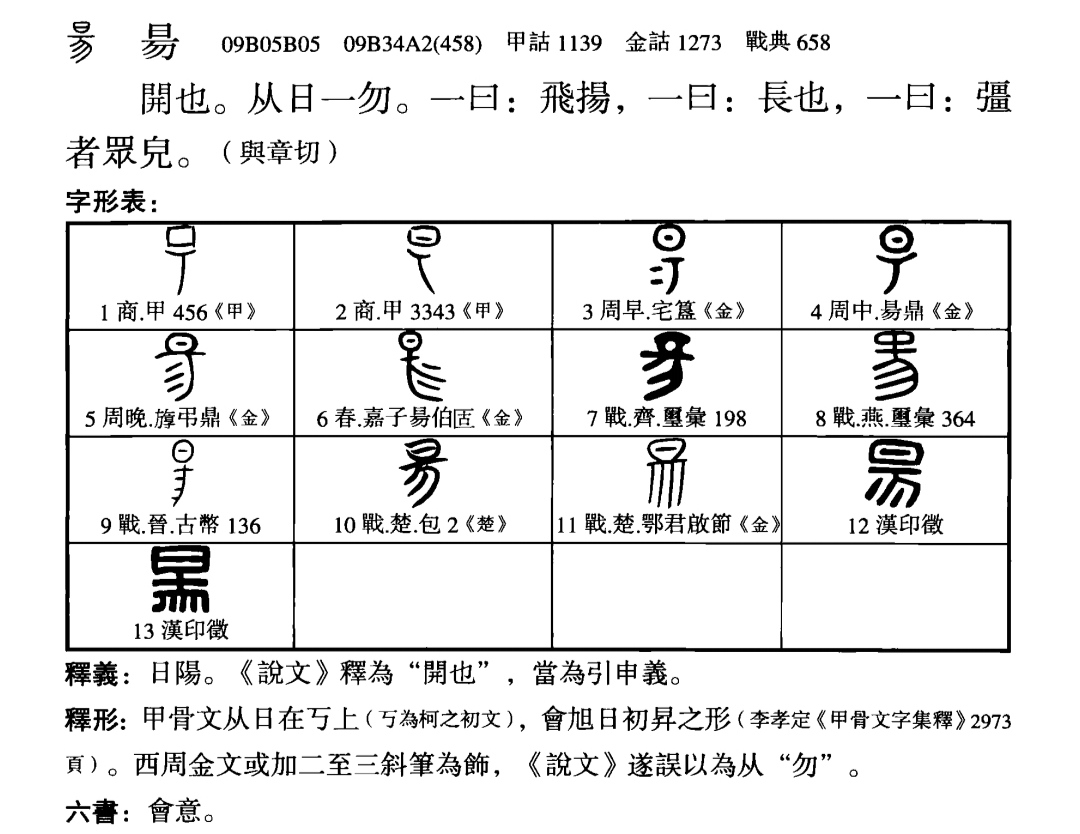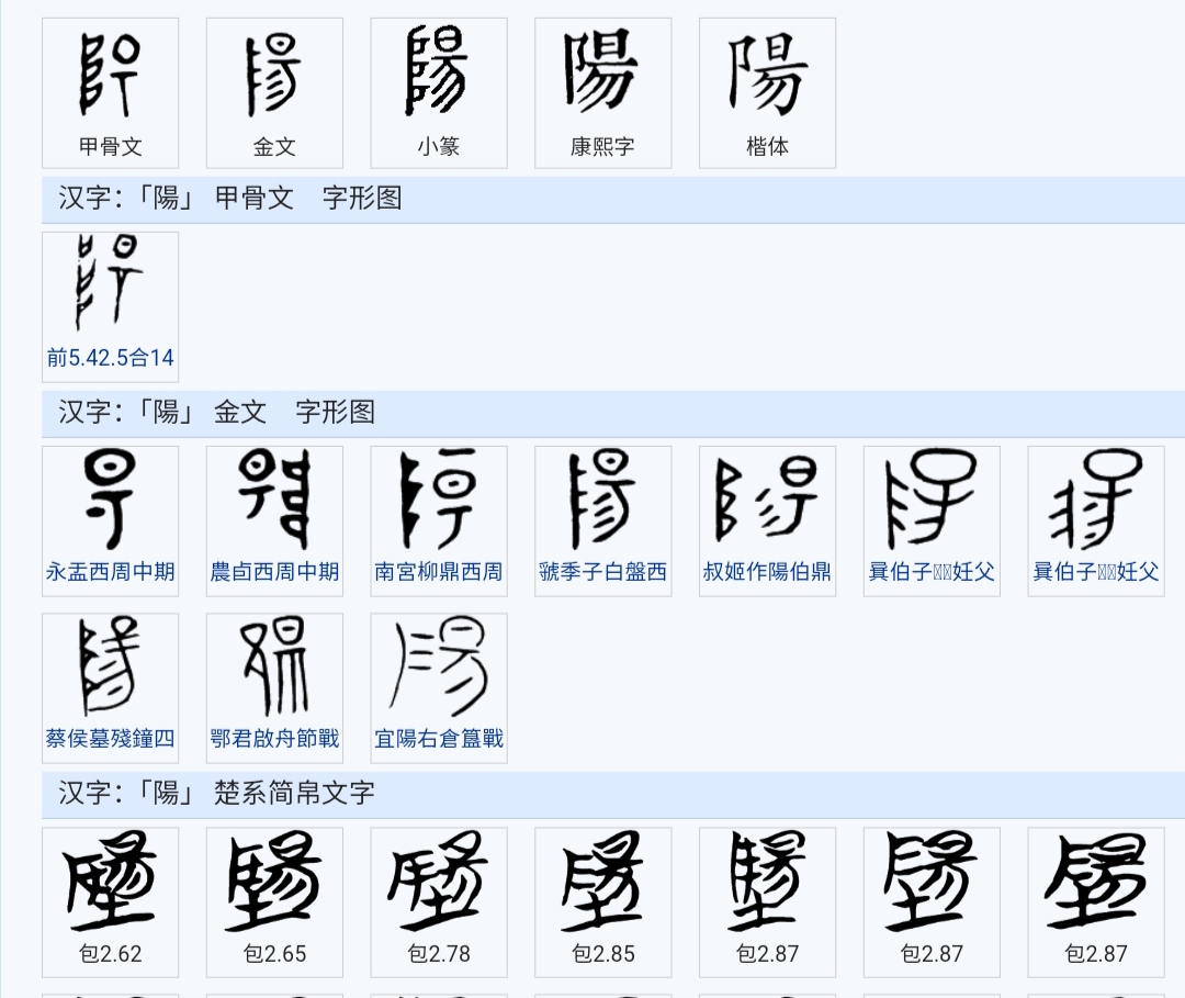 昜 yáng 古同“陽”。陽,古同暘 yáng 日出。古同揚。古同湯。《説文》昜,開也。一曰飛揚。一曰長也。一曰彊者,眾貌。清·段玉裁·注:此陰陽正字也。陰陽行而侌昜廢矣。