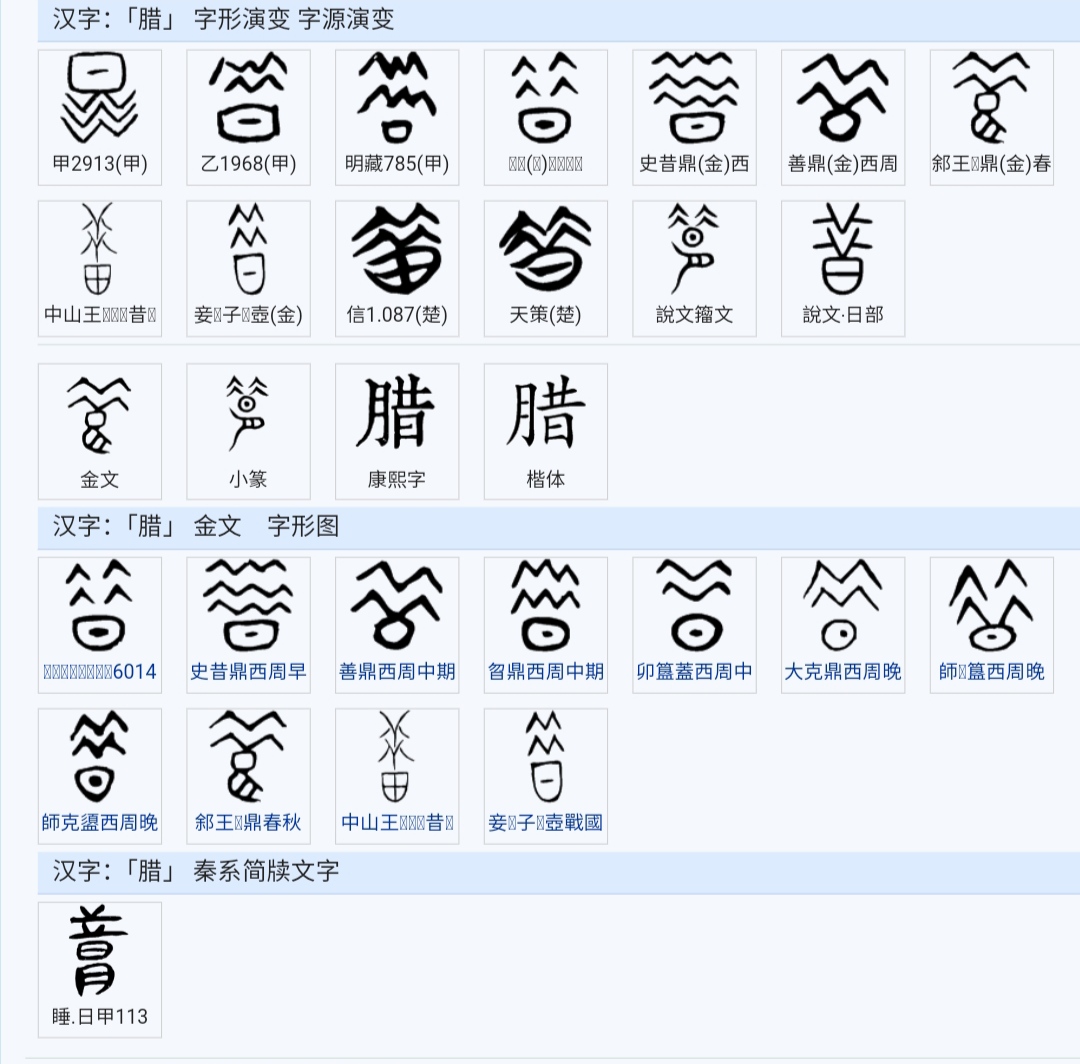 另,有甲骨文字詁林1511【來肉】字形可釋讀為臘(臘)字。詞例:有告臘豕,呼逐。秋收後冬狩獵(獵)而醃漬燻曬肉乾。若以秋收為歲末,則冬季為來年。與麥同來納貢,是為來肉(臘肉)。來lai臘la(緬甸語來la)