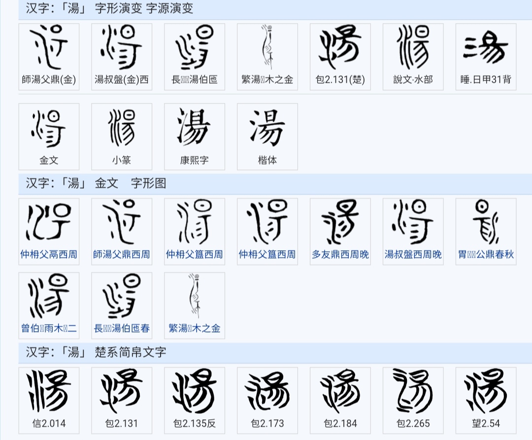 湯,古同唐。商朝的開國之君。又稱成湯、成唐、武湯、武王、天乙等。如:湯武之道(指商湯與周武王討伐暴君之事);湯鼎(商湯時所鑄之鼎);湯刑(商湯制定的刑法);湯武(商湯與周武王的並稱)