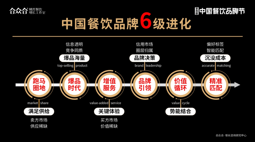 做餐飲有 6 級進化,從跑馬圈地到爆品時代、增值服務、品牌引領、價值循環,再到精準匹配。不是説今天到了第 6 階段,你只做第 6 階段的事就好了,該有的東西一定要有,要把前面都做好了才會到第 6 階段。