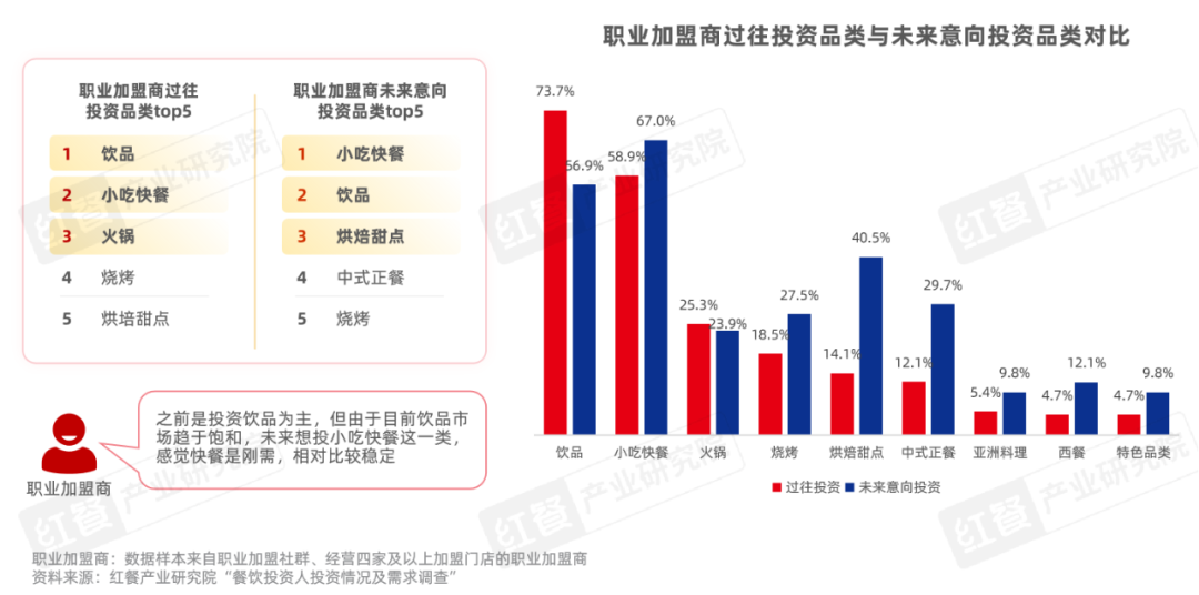 特色小吃的火熱使其成為餐飲投資最受關注的領域之一。根據紅餐產業研究院發佈的《餐飲品招發展報告2024》,包含特色小吃在內的小吃快餐已經超越飲品,一躍成為職業加盟商最為青睞的投資方向。