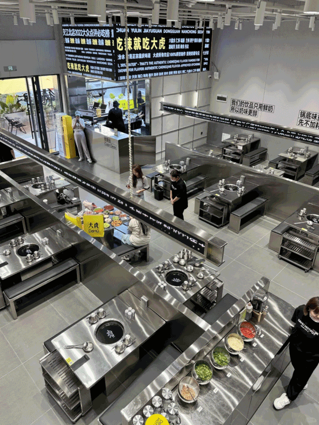 而其**通吃的本質,正是“融合”,**大虎老火鍋融合了地攤火鍋的價格、工業場景的質感、重慶鍋底的傳統味道以及時尚前衞的甜飲品,使得其迅速崛起。