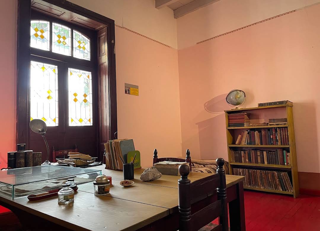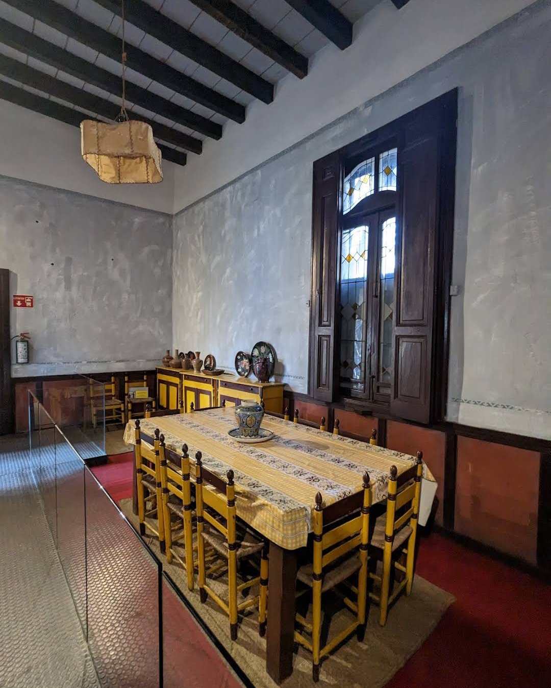 餐廳展廳的後面則是故居,據説一切陳設都沒有改變,墨西哥政府在1990年就開啓了這個博物館,據説室內實物一概未變。能看到托洛茨基生前用過的一些東西,廚房和餐廳乾淨,整潔。我注意到一些餐具都是粗陶,連一件起碼的瓷器餐具都沒有。托洛茨基的書房和卧室也非常簡潔,書桌上擺了很多化石,不知道是擺設還是曾被托洛茨基研究過。他的卧牀上也是一些粗棉寢具,相比慈父的那張窄牀也是不遑多讓,老革命的高風亮節真的讓人感動,你能感受到他的那種質樸的,純粹的,偉大的精神世界。