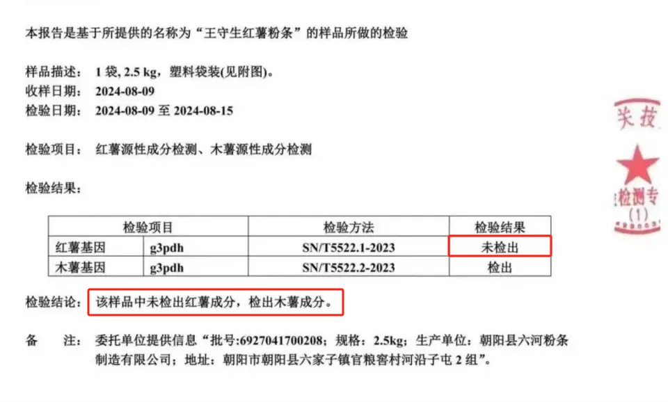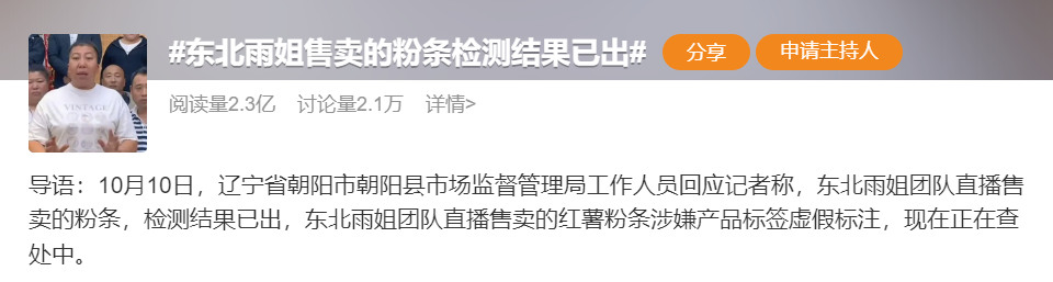 這雨姐呢?連職業打假人的錢都不想賠,自然也不願意給消費者賠償。鬧到這一步,就只能靠司法介入了。根據遼寧朝陽縣市監局檢查後公佈,東北雨姐賣的這個紅薯粉,確實存在虛假標註。什麼意思呢?就是她賣的這個紅薯粉,裏面確實摻了木薯粉。