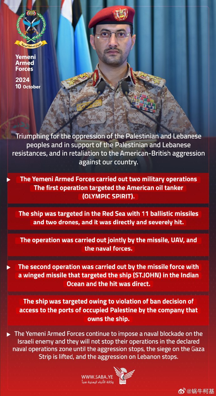 葉海亞稱胡塞武裝使用導彈和無人機襲擊了“奧林匹克精神號”油輪和“聖約翰號”貨船,並直接命中。