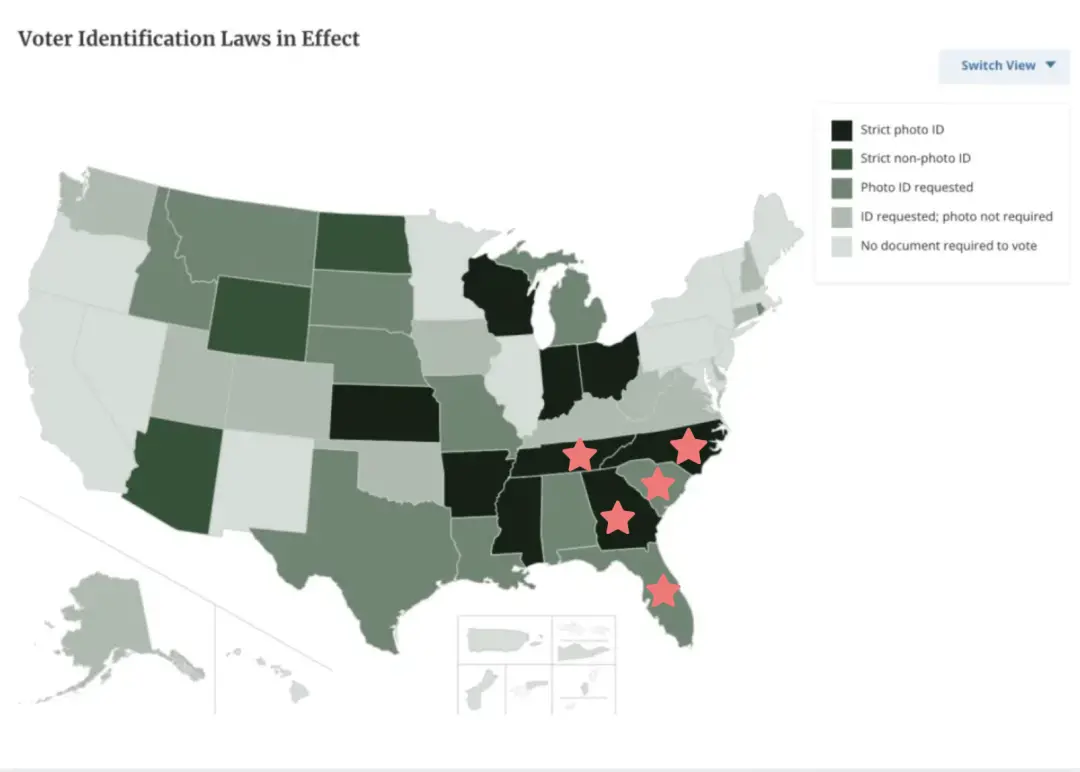 全美各州對選民投票的證件要求,右側紅色星標的就是受災嚴重的五個東南部州