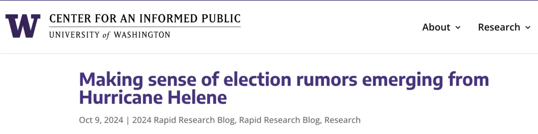 本週三,華盛頓大學公共知情中心的研究人員發佈了一份快速研究報告,標題是《解讀颶風海倫引發的選舉謠言》,文章追蹤了颶風海倫登陸以來在社交媒體上傳播的主要虛假信息,並預測在選舉日前後,這些謠言很可能繼續滋長。