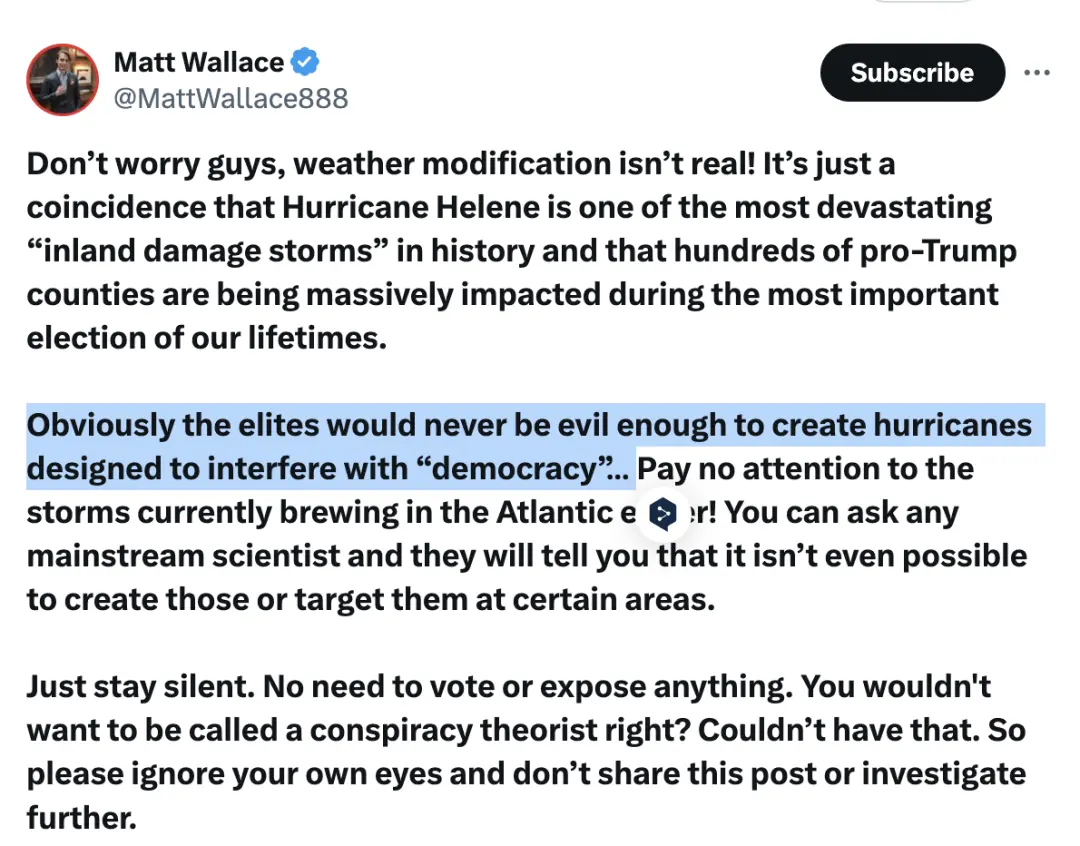 研究人員發現,9月28日一個有210萬粉絲、名叫Matt Wallace的右翼網紅髮布了一篇推文,他用反諷的語氣説,颶風海倫是史上破壞力最強的內陸颶風之一,在我們一生中最重要的一次選舉期間,它導致一百多個支持川普的郡嚴重受災,這只是個巧合。“那些精英們絕不會這麼邪惡,專門製造颶風來干預我們的‘民主’”。
