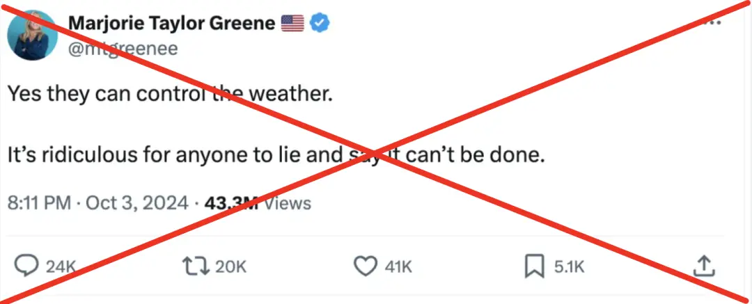 然而,近幾天,另一種將颶風海倫和干預選舉陰謀論聯繫在一起的虛假敍事愈演愈烈,聲稱颶風海倫是民主黨控制的氣候武器,用於攻擊共和黨人聚居的地區,讓他們難以投票,甚至於有美國國會議員都在放大這一陰謀論。這究竟是怎麼回事?
