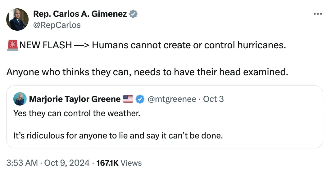 對於格林議員的瘋狂言論,連她的共和黨同僚都看不下去了。佛羅里達州聯邦眾議員、共和黨人卡洛斯·吉門內斯在10月9日就評論了格林那條陰謀論推文,他説,“注意,人類無法創造或控制颶風。任何覺得人類可以這樣做的人,都應該去檢查一下他們的腦子。”