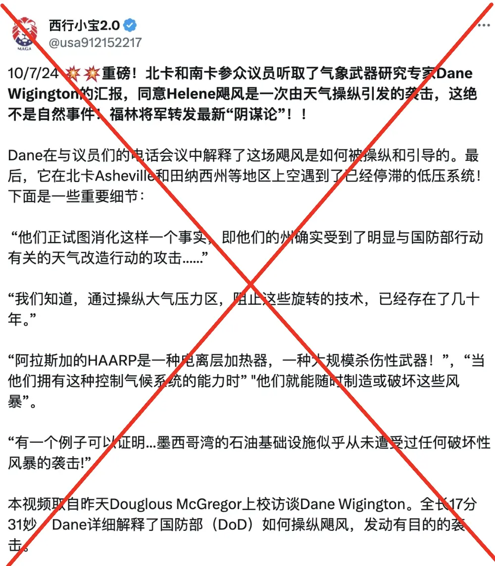 這則推文瀏覽量接近1200萬次,開啓了颶風海倫被人為操縱這一陰謀論。