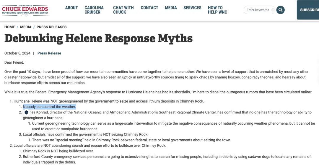 類似的,北卡羅來納州國會眾議員、共和黨人查克·愛德華茲(Chuck Edwards)也在其官網上發佈了一封闢謠信,對目前傳播的多條虛假信息進行澄清,其中也明確提到了沒有人能控制天氣。