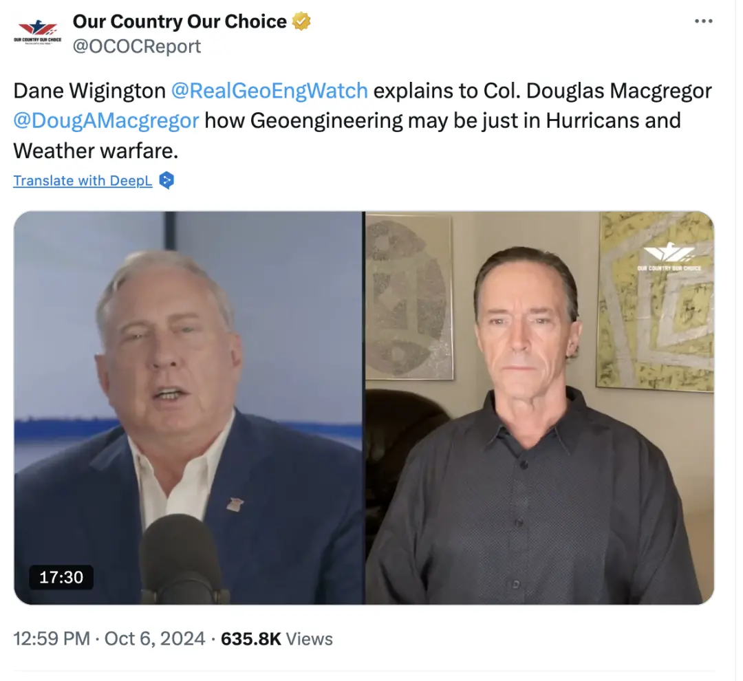 例如長期吹捧普京、散播陰謀論的退役美國軍官Douglas Macgregor,就邀請一位長期反對氣候變化的陰謀論者Dane Wigington錄製視頻,煞有介事地介紹操縱颶風是如何實現的。