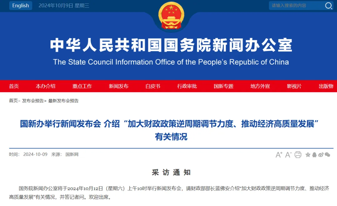 今天,國新辦也發佈預告,10月12日(週六)上午召開新聞發佈會,財政部長藍佛安介紹“加大財政政策逆週期調節力度、推動經濟高質量發展”。