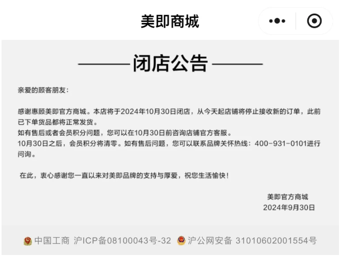 除了服裝店之外,美妝店也面臨這一困局。近期,歐萊雅旗下知名品牌美即官方商城宣佈將於10月30日正式關閉,自9月30日起,該店鋪將停止接收新訂單,但已下單的商品將按原計劃正常發貨。目前,美即在天貓、京東等主流電商平台的官方旗艦店已無法搜索到,標誌着其線上渠道的全面收縮。