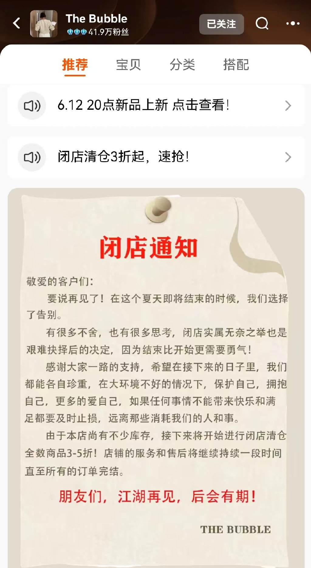 同樣是在7月份,淘寶女裝店“The Bubble”也在店鋪首頁發佈了閉店通知,並稱“接下來將開始進行閉店清倉”“店鋪的服務和售後將繼續持續一段時間,直至所有的訂單完結。”
