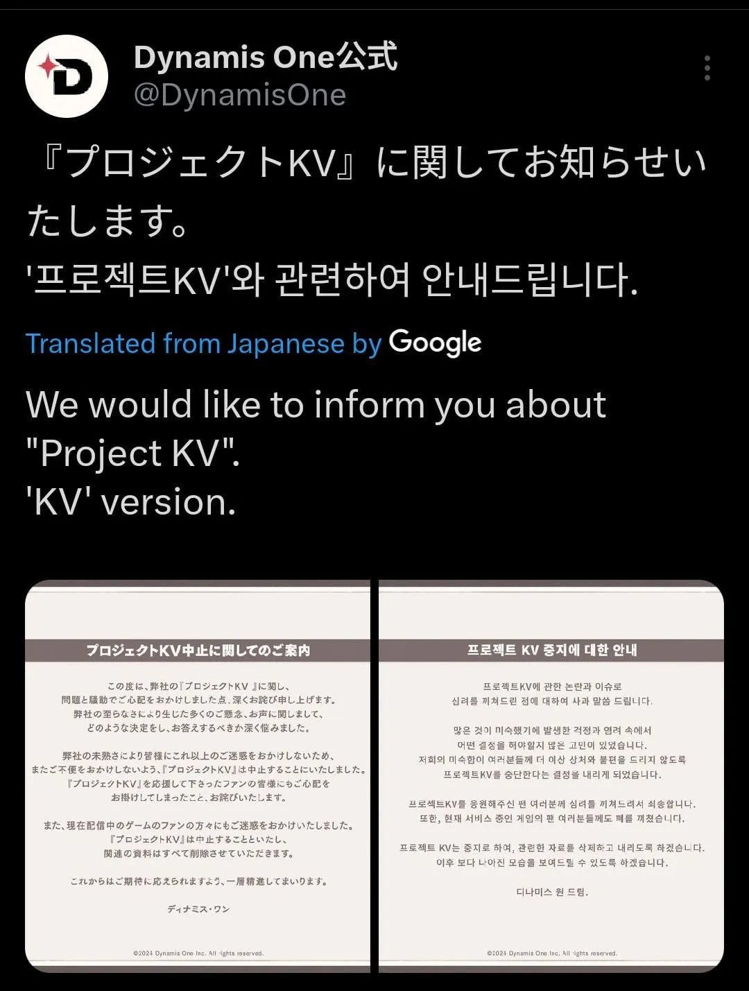 9月8日,Dynamis One宣佈Project KV正式中止開發,遊戲相關素材全部刪除,官方的10萬粉賬號也無法再搜索到。從9月1日發佈首支宣傳視頻到8日關門,新項目上演了一場現實版“七日死”。