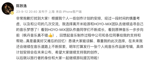 去年9月,陳致逸宣佈自己已經離開米哈遊及旗下音樂工作室HOYO-MiX。有人祝福,也有人不看好。無論陳致逸的下一個項目是什麼,有一個事實是“前《原神》音樂製作人”的頭銜都能為新項目帶來關注度和流量。這是非二次元項目很難帶來的流量。