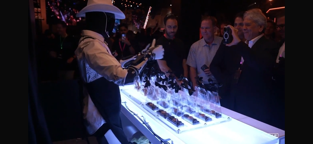 Optimus機器人在發佈會上以一段集體舞蹈展示靈活性,並在發佈會結束後的參觀活動上充當服務生,為到場嘉賓們提供酒水服務。