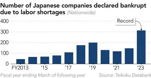 日本帝國數據庫公司指出,因勞動力短缺而破產的公司,在去年已經創下自10年前開始收集數據以來的最高紀錄,多達313家。