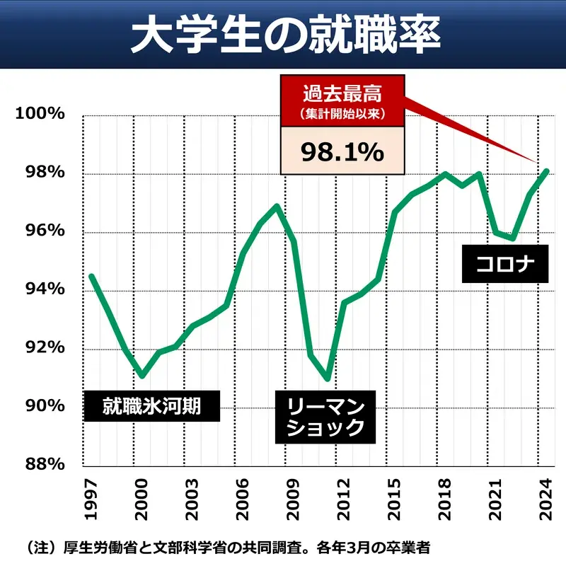 數據顯示,今年日本大學畢業生就業率再創新高,達到98.1%,這是自1997年有統計以來的最高水平。《日本經濟新聞》直呼: